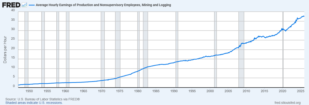 This page uses official U.S. Bureau of Labor Statistics data accessed through the Federal Reserve Bank of St. Louis (FRED). The series tracks wage levels from 1947 to the present, offering one of the longest continuous labor‑market datasets available for the natural resources sector.