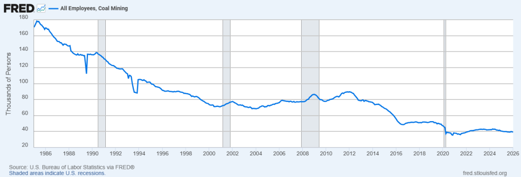 This page provides a clear, data‑driven look at coal mining employment using official labor market data from the U.S. Bureau of Labor Statistics, accessed through the Federal Reserve Bank of St. Louis (FRED).