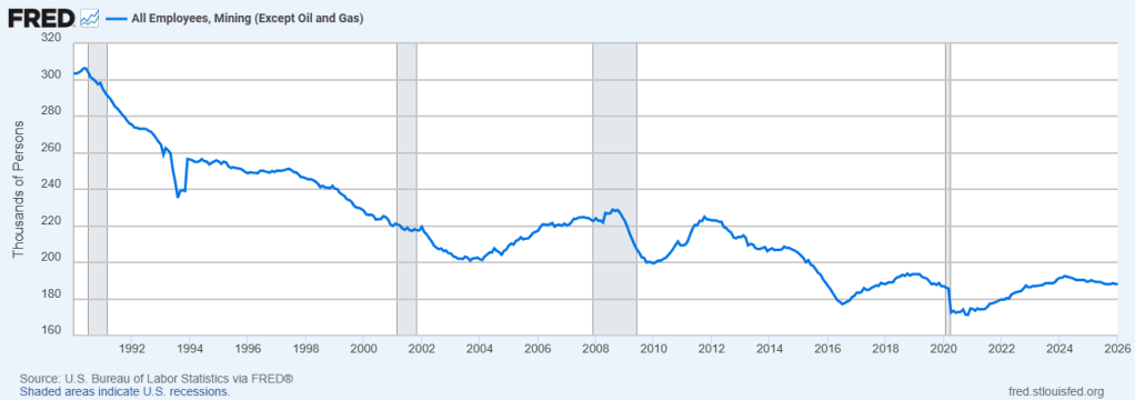 This page uses official labor market data from the U.S. Bureau of Labor Statistics, accessed through the Federal Reserve Bank of St. Louis (FRED), to track national mining employment over time.